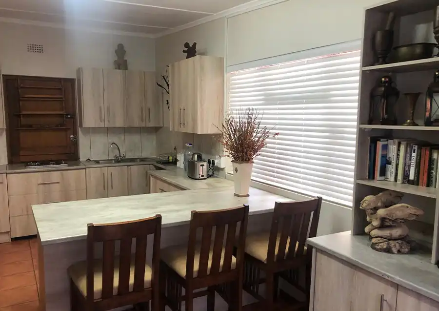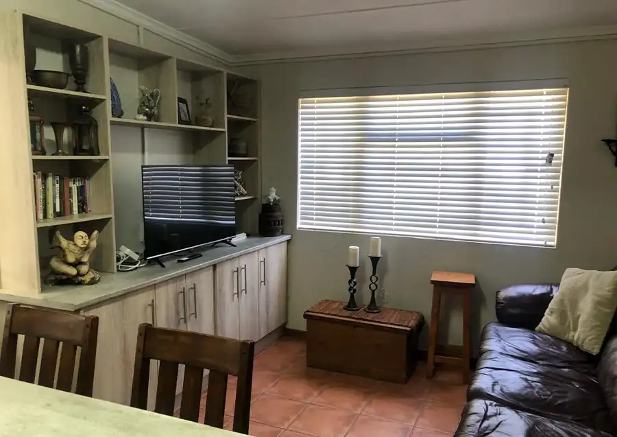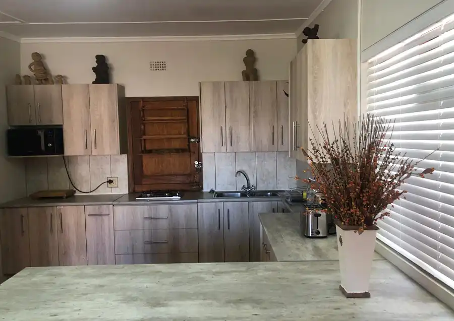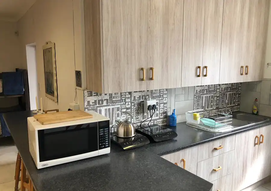 One separate bedroom with double bedwith en-suite bathroom with modern open plan kitchen fully equipped with induction stove, microwave, fridge, utensils, etc... Private outdoor lapa with braai facilities under milkwood trees. TV with movie channels and free wifi. Laundry and cleaning services available against a fee. Restaurant and bar services available during operating hours at the main facility around 200 meters away. Secure parking.