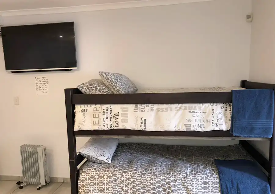 Ideal for small family, (sleeps 6). One bedroom, queen bed, 2 bunk beds, open plan kitchen and living room and seperate bathroom. Private outdoor patio with braai facilities and entertainment area, tv and wifi with safe parking area. Restaurant and bar services available during operating hours. Non-smoking. Pets are welcome.